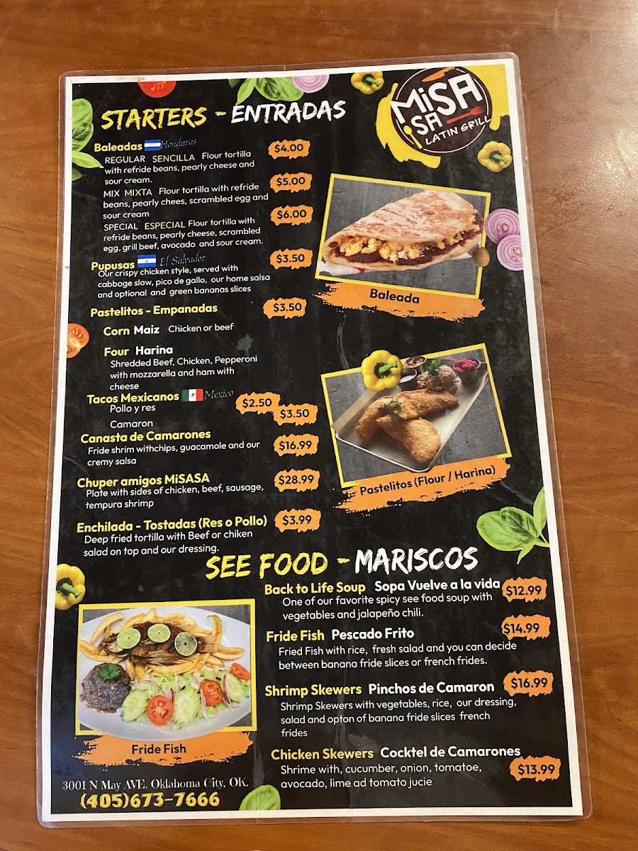 Welcome to Misasa Latin Grill, located at 3001 N May Ave, Oklahoma City. This vibrant eatery immerses you in authentic Latin flavors, showcasing dishes that celebrate regional diversity. Reviews highlight the warm, welcoming atmosphere, where the owner often shares insights about the culinary customs that inspire the menu. Standout dishes include the exquisite seafood soup, mouthwatering empanadas, and perfectly made steak platters. Diners appreciate not just the food but also the friendly service, making every visit a memorable experience. If you're craving genuine Latin cuisine with a personal touch, Misasa Latin Grill is a must-visit destination.